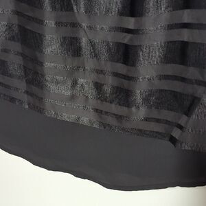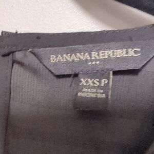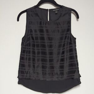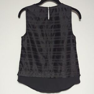 This sophisticated black blouse by Banana Republic showcases a sleeveless design with a captivating sheer grid pattern. The rounded neckline and layered hemline add a modern touch, while the fabric's subtle sheen enhances its elegant appeal. *no fabric tag