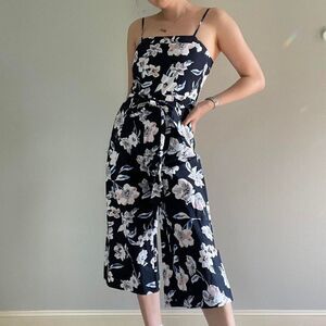 Effortlessly chic and comfortable, this Banana Republic jumpsuit is perfect for any occasion! Featuring a beautiful navy blue floral print, this sleeveless jumpsuit has adjustable spaghetti straps, a flattering belted waist, and wide-leg cropped pants for a breezy, stylish fit. Made from lightweight, flowy linen, it’s great for casual outings, brunch, or even a dressed-up evening look.