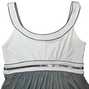 This two tone grey dress has sequin banding at the waist. There is a side seam waist zipper and hidden side seam pockets. It is made is lightweight and stretchy polyester/elastane fabric. In excellent used condition.