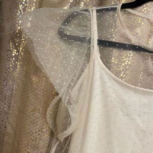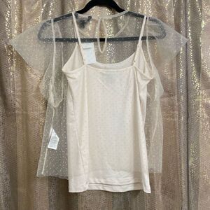 This is a beautiful very very pale pink colored stretchy camisole tank top that has this beautiful sheer mesh polka dot top that goes over it. They are two separate pieces that are meant to be worn together. Super fairycore/cottagecore/romantic coquette/balletcore vibes to me. This is super dainty, beautiful and unique. Perfect for a casual occasion, office or can also be dressed up for a special occasion its that cute. Size small.