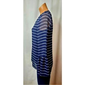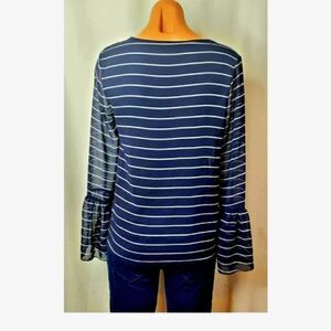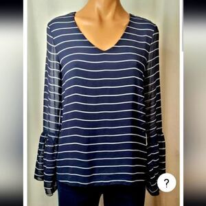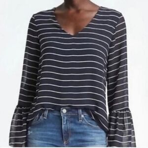 Banana Republic V Neck Navy and White Striped Blouse with Sheer Bell Sleeves XSM
