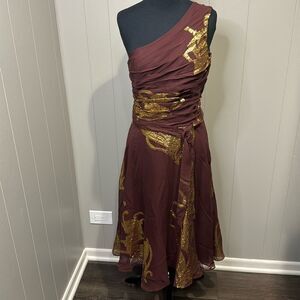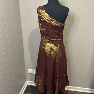 Banana Republic burgundy, gold metallic silk blend draped one-shoulder midi. New, with tag. Bodice of draped pleats. Invisible side zipper. Tie belt. Flared skirt. Lined. Outer silk/metallic blend. Lining 100% acetate. Size 6. Armpit to armpit approximately 27 inches. Shoulder to hem approximately 44 inches. Nonsmoking home.
