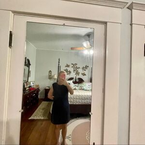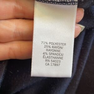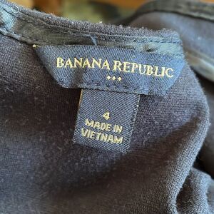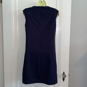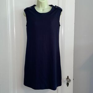 Banana Republic dark navy blue polyester/rayon/spandex knit sleeveless sheath dress with military type button tabs on shoulders