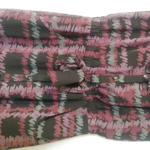 Black with maroon, pink and gray patterns. 2 front pockets.