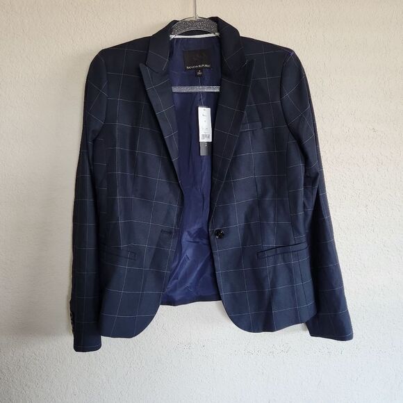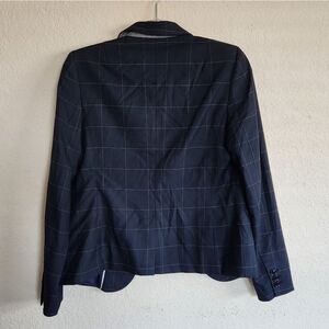 Notched lapel. Long sleeves with buttoned cuffs. One-button closure. Three non functional pockets. Lightweight shoulder pads. Center back vent.Lined.