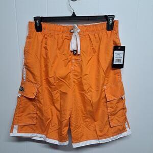 Banana Split B-Split men's board shorts in bright orange with white stripe trim. New with tags. Features an elastic waistband with drawstring, mesh lining, and multiple cargo pockets—ideal for beach, pool, or casual summer wear. Durable 100% polyester fabric with a lightweight feel.