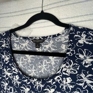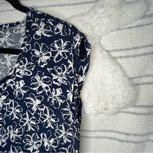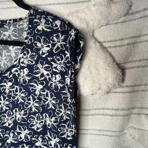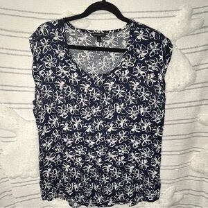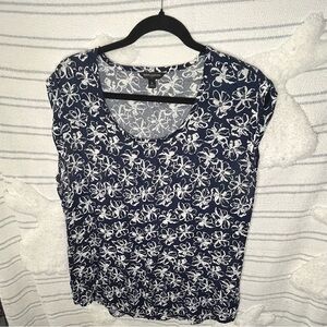 This elegant banana republic blouse features a beautiful blue floral pattern on a relaxed, flowing design. The top is crafted from a light, comfortable material, perfect for casual wear. With its stylish scoop neckline and cap sleeves, it offers a chic and versatile addition to any wardrobe. It is second-hand but in perfect condition, no wear or damage to the fabric.