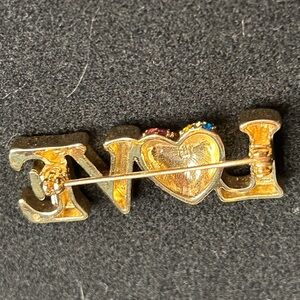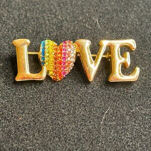 Elegant gold brooch featuring a vibrant multicolor heart. Perfect for adding a touch of love to any outfit.