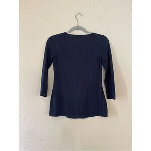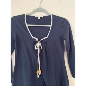 Has the front tie. White trim. No flaws. Navy color. Very Y2k peasant style. Silk and cotton blend.