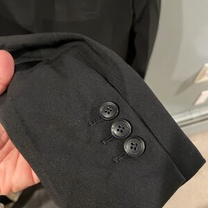 Classic Banana Republic Black Blazer - Size 6. This versatile black blazer from Banana Republic features a timeless single-breasted design with a one-button closure and notched lapels. It has flap pockets and a tailored "Classic Fit," making it a sophisticated layering piece for professional or formal wear.
