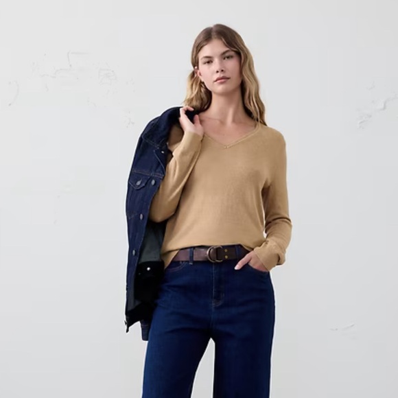 Banana republic cotton silk tan v-neck long sleeve lightweight knit sweater sz L