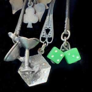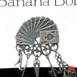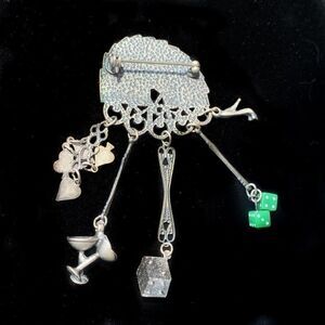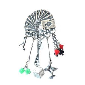 Rare and hard to find vintage Banana Bob gambling Vegas theme pin. It features a hand of cards at the top, attached to filagree, dangling are dice charms, metal dice, heels, champagne glasses and card suits.