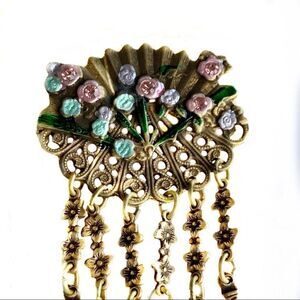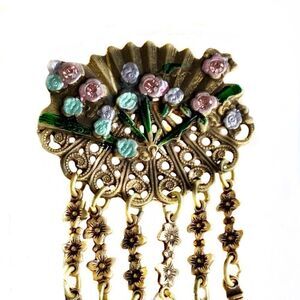 Beautiful romantic Banana Bob large vintage pierced back theme earrings. These feature a romantic fan on a filagree background, the fan has multiple pink and blue enamel flowers some with crystal centers. At the bottom of each earring are 6 crystal dangles for lots of sparkle and movement when you wear them. Unique and elegant, new old stock from the 1980’s. 2.5” L x 1.5” W