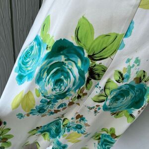 This vintage Banana Republic cocktail dress from the early 2000s is made from luxurious 100% silk duchess satin with natural slubs, giving the fabric a subtly textured sheen. The ivory base is decorated with oversized blue and teal floral blooms and vivid green leaves for a bold, painterly effect.
