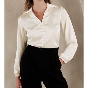 Banana Republic 762890 Women Sz M Snow Day/Ivory Satin Covered-Button Blouse