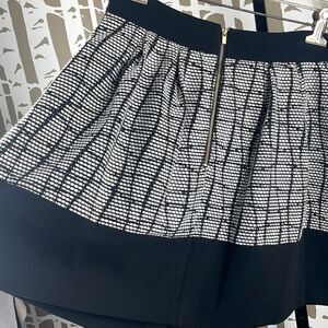 Banana Republic Black & White Jaquard Knit Asymmetrical Crossover Mini Skirt size 4. Features black and white textured jacquard knit, contrasting black crepe trim on waistband and hemline, asymmetrical hem, crossover styling, gold exposed back zipper, fully lined. Gently worn and laundered with no flaws to note. Such a pretty skirt for the holiday season - just add a white button down top and some sparkly jewelry and you are ready to go!