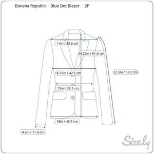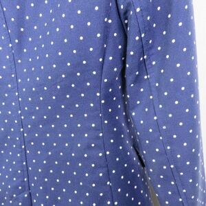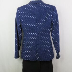 This is a Petite Banana Republic blazer for ladies in a dark blue with white polka dots. Dress up with a skirt for the office or with jeans for fun.