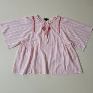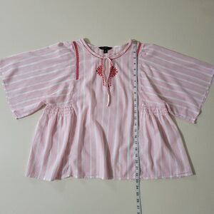 This Banana Republic blouse in red stripes features short wide sleeves and a relaxed fit, perfect for warm weather. The tie front detail and embroidery adds a boho touch. Ideal for casual outings, this top combines comfort with a chic design. Last photo shows a faint spot at lower front. Very nice condition.