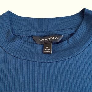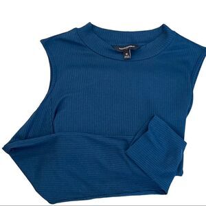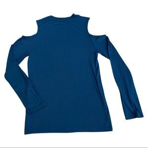 Beautiful midnight blue color with the fashionable cold shoulder sleeve detail makes this garment a simple and tasteful addition to your wardrobe. Neckline is a modest mock collar. Fabric is soft to the touch and is finely gaged ribbing. Longer length adds to the functionality.