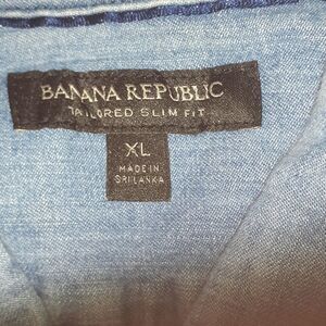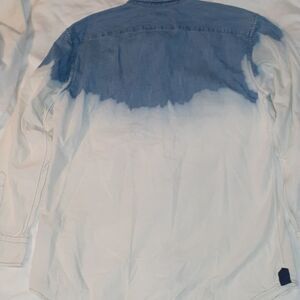 A Banana Republic long sleeve button up Tailored Slim Fit in medium weight denim. Its been dip dyed in bleach and looks really sharp. The grosgrain behind the buttons and on the side hems are still blue, as are some threads on the sleeves.
