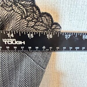 • Fabric & Pattern: Sophisticated grey herringbone with intricate floral lace appliqué around neckline and armholes