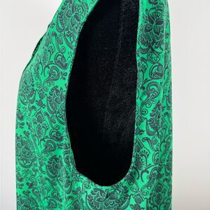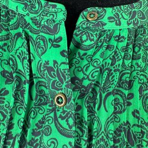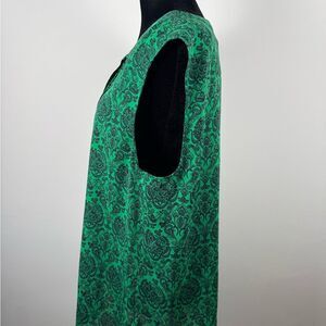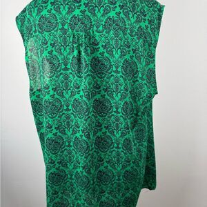 This elegant sleeveless blouse from Banana Republic features a vibrant green hue with a sophisticated navy blue pattern. Designed with a mandarin collar and pleated details, it offers a boxy silhouette perfect for both casual and business casual settings. Lightweight and comfortable fit. Measurements: shoulder to hem approximately 29 inches. This item is from a smoke free and pet free home.