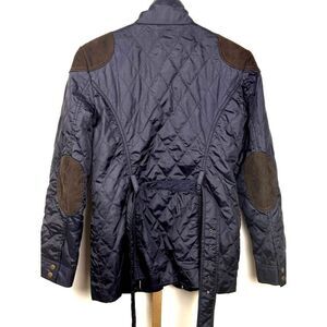 This is a lovely, lightweight and warm jacket from Banana Republic, navy blue with a diamond quilted pattern, faux suede accents on the elbows and shoulders, with a removable belt at the waist. Size XS, Polyester outer and filling, excellent pre-owned condition. Please see photos for more detail.