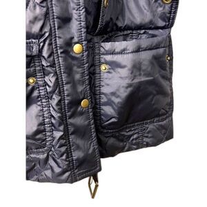This is a lovely, lightweight and warm jacket from Banana Republic, navy blue with a diamond quilted pattern, faux suede accents on the elbows and shoulders, with a removable belt at the waist. Size XS, Polyester outer and filling, excellent pre-owned condition. Please see photos for more detail.