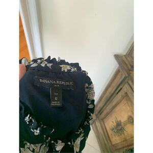 Banana Republic Ruffle Neck Midi dress size 12. The dress features a white and yellow floral print, a ruffled neckline with a tie detail, short ruffled sleeves, and an elasticated waist. It has a tiered skirt and falls to about mid-calf length.