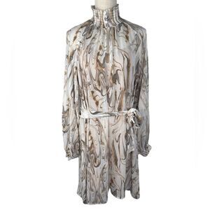 Banana Republic Tan & Cream Smocked Crinkle Texture Long Sleeve Dress