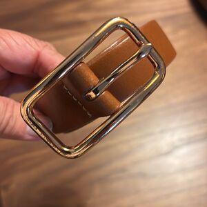 Banana Republic Tan Leather Belt with Gold Rectangle Buckle - Size Medium. Leather measures 43.25” excluding buckle. Some minor wear on the buckle see last photo. Otherwise, EUC.