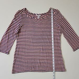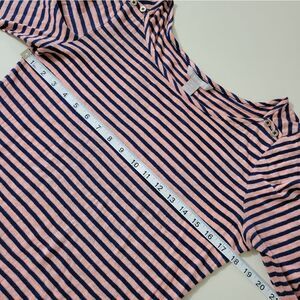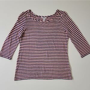 Classic boatneck top by Banana Republic is made of a linen blend that makes it very lightweight. The coral and navy stripes give a nautical feel along with the decorative buttons on both shoulders. Quarter length sleeves give the finish touch to this timeless top that pairs nicely with denim or khaki. Top is in very nice condition.