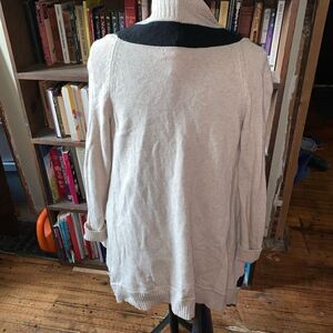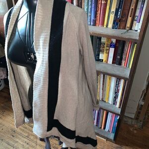 Banana Republic cream and black stripe, drape front, merino wool, nylon, and cashmere cardigan. Approximately 18 inches from armpit to armpit and 30 inches long. From a pet and smoke free house. Happy to bundle!