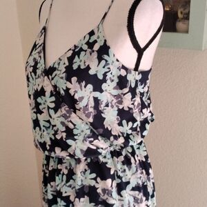 Pretty maxi in a dark floral graphic. Flowers are aqua, white and gray. Spaghetti straps. Pull over style. Wrap look all the way down. Fully lined. Adjustable straps. Size 2 measures 34 at chest, 26-38 at elastic waist, 42 at hips, 54 long from shoulder to hem. Pretty for all year.