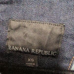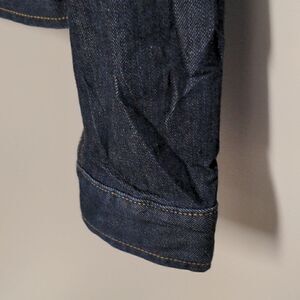 Dark Wash button down denim jacket. Two button pockets and two regular pockets on front. Adjustable tabs on bottom