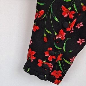 Black background with red, pink and green floral design. Size small. Round neckline with keyhole button front and zipper back. Long sleeves, knee length. Slanted seam under bust, waist at back. Slightly flared skirt. 5 covered buttons on sleeves. Beautiful cut and design. Fully lined. Beautiful drape. Measures 19" pit to pit, 14" side to side waist, length is 35.5 ".