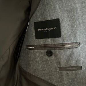 Dry clean only. Woven in Italy by Progetto Uno. Gray with small pinstripe. Pockets inside and out. Comes with extra buttons. Original price $298