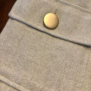Gorgeous tailored herringbone blazer with matte gold buttons by Banana Republic. Featuring a creamy ivory collar with metallic gold threading to give an added sparkle and glow. Gold silky, fabric lining. Cotton with linen blend. Length 20”, Width 17” pit to pit. Like new.
