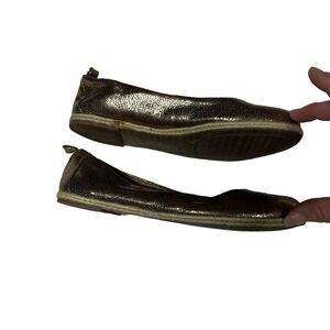banana republic size 6 round toe ballet flat. gold metallic shimmer cracked crackle in color. two row jute rope around bottom. Left shoe, inside has some wear to the rope, see photo 4.