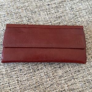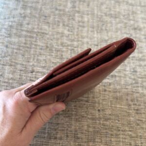 In very good condition. Has a snap closure pocket iutside along with a zipper pocket. Inside has an ID holder, 10 cc slots and 2 currency sleeves. Snap closure. Measures 7.5” x 3.75”. Nice medium brown leather.