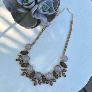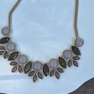 Light and dark gray stones in a decorative soft gold colored setting and chain.