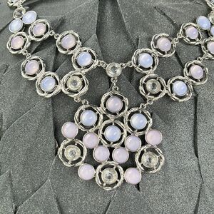 An extremely beautiful necklace with intricate detailing in white and silver tones silver chain snd stone settings . Lobster claw clasp.