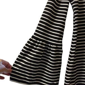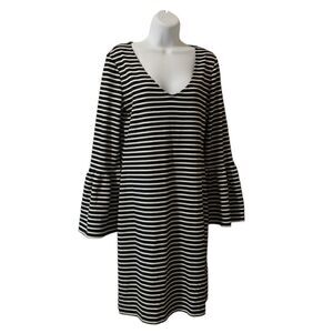 Figure flattering black and white stripped V neck dress with long bell sleeves. invisible side zipper, nice thick jersey knit size M measures flat 18 " pit to pit 37" long in excellent condition