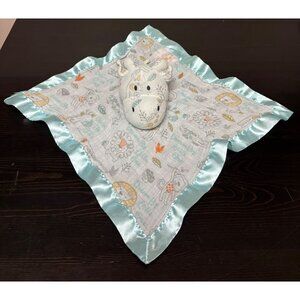 A soft and comforting security blanket featuring a plush animal head, perfect for providing tactile comfort. Satin trim adds a smooth, gentle touch. Safari-themed.