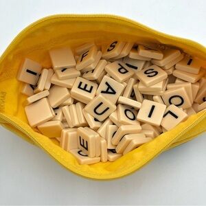Yellow banana bag with tiles for Bananagrams Word Game. It is used in very good condition and has 143 tiles in bag.
