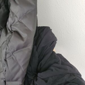 Color is almost a black green gray. Not pitch black. Please use zoom and look up close as it is hard to describe. Diamond quilted 60% down 25% waterfowl feathers,10% down fibers and 5% other