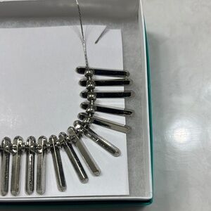 This striking silver necklace features a unique fan-like design with vertical metal bars arranged in a graduated pattern. The elongated rectangular bars create a bold, architectural look, perfect for adding a contemporary touch to any outfit. The brushed finish enhances its modern appeal, making it a standout piece in any jewelry collection.