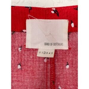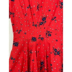 Classic Band of Outsiders mini Dress in red with a blue floral print, preppy - perfect for summer. Very 2010s Twee, fitted bodice with v-neck and short sleeves, skirt is full and flowy pieced together circle. Great construction. There is an exposed zipper, though on the side, not super flashy. Labeled size "2" which meant Medium, though they ran small, please check measurements!
