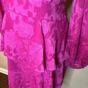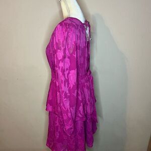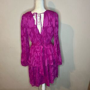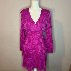 This beautiful Band of Gypsies floral mini dress in fuchsia is perfect for any occasion. The dress features a fit and flare style with long sleeves and a short dress length. It also includes a tie back for added detail.