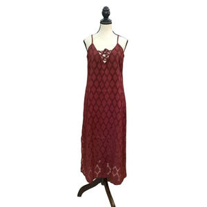Band of Free Burgundy Diamond Pattern Lace-Up Spaghetti Strap Midi Dress